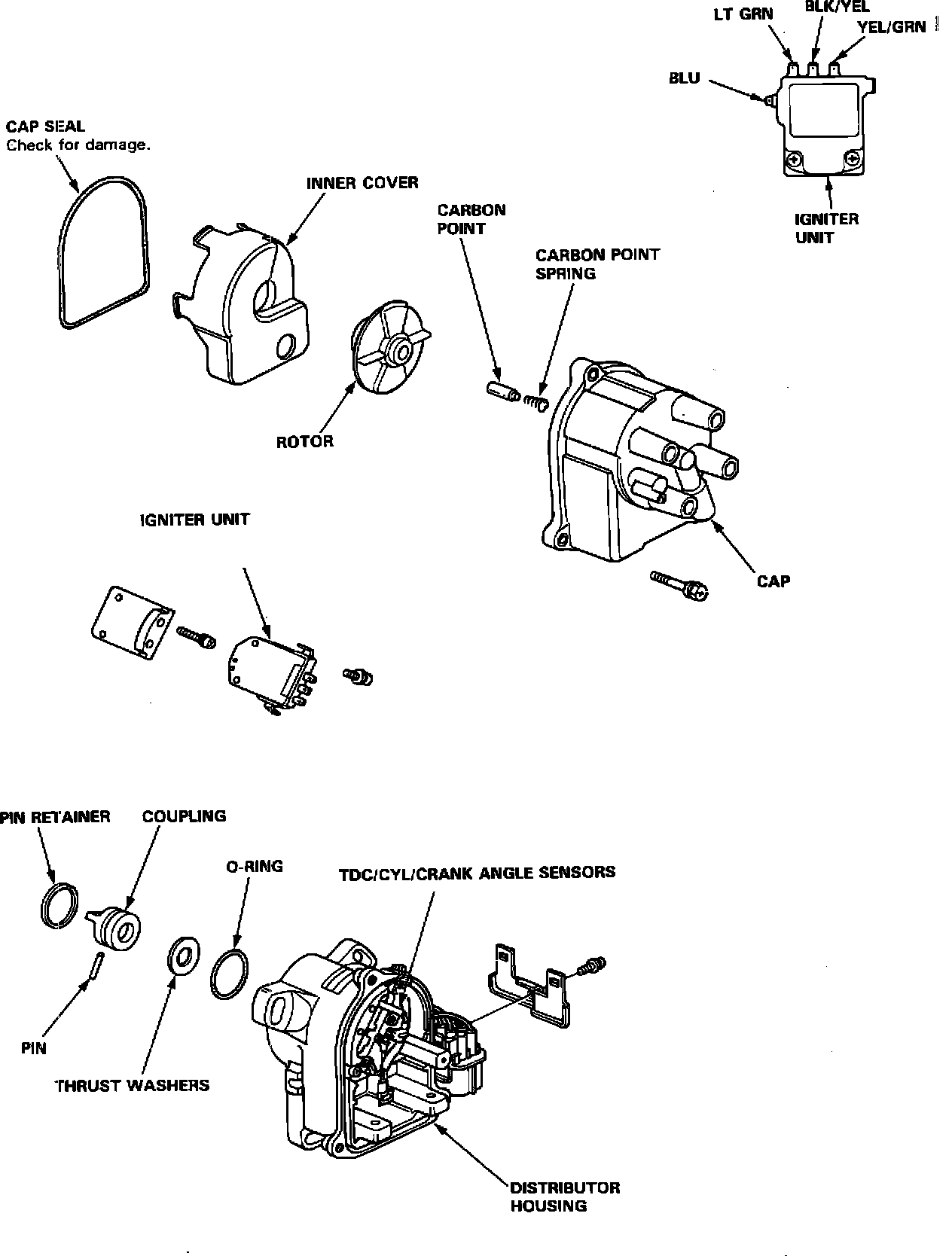 The TDC/CRANK/CYL sensor, found inside the distributor housing, consists of the TDC sensor rotor, CRANK sensor rotor, and cylinder sensor rotor their associated pick-up coils, and a common shaft that is directly coupled to the camshaft. As the teeth on the sensors break the flux lines of their respective pick-up coils a voltage pulse is generated. These pulses are the input signal to the engine control unit (ECU).