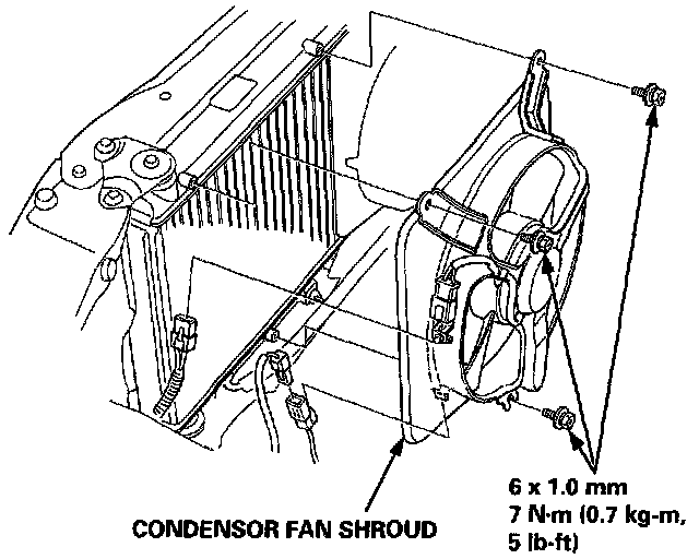 5. Disconnect the connectors from the condenser fan, and remove the connector from the compressor. Remove the three mounting bolts and remove the condenser fan shroud.