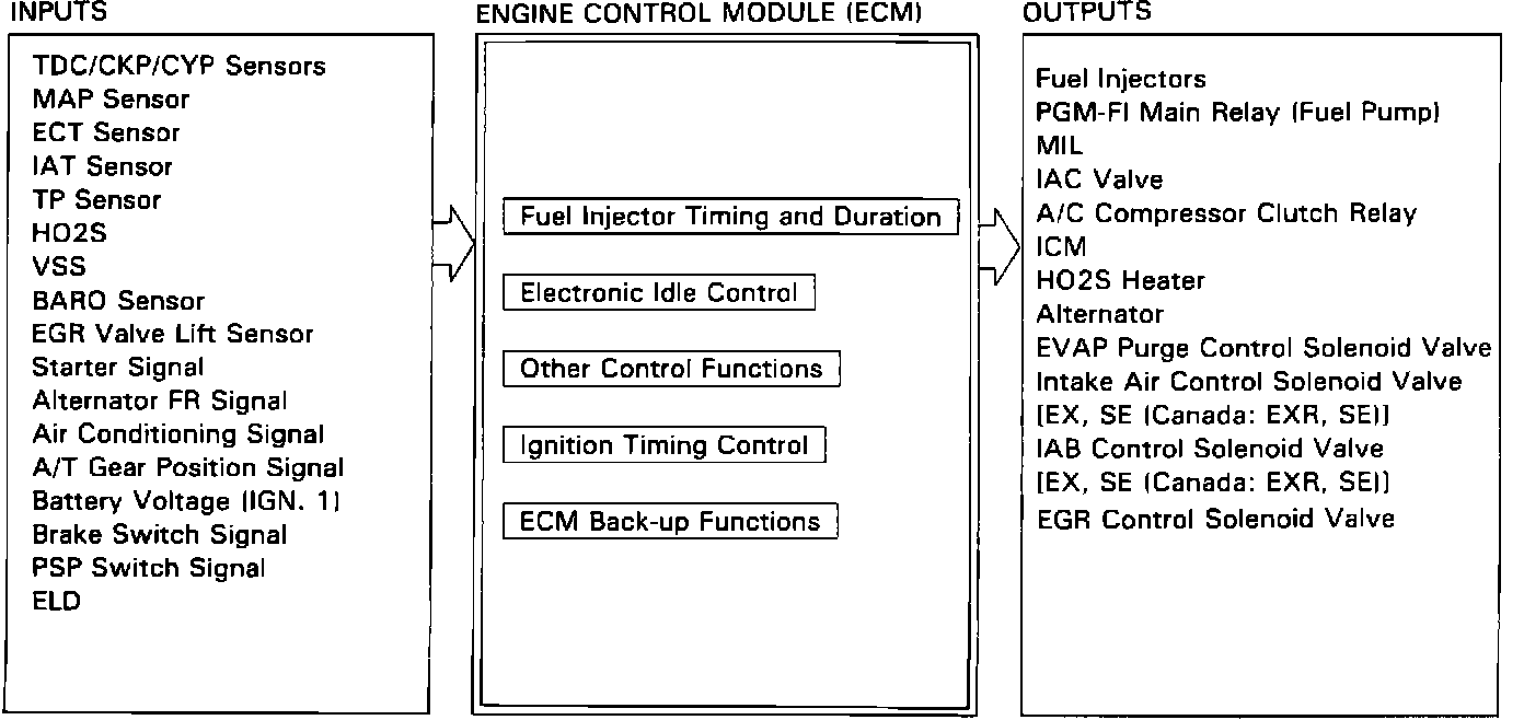 The ECM contains memories for the basic discharge durations of the fuel injectors (determining the air/fuel mixture) at various engine speeds and manifold pressures. Basic discharge durations of the fuel injectors is modified by signals from various sensors to obtain final discharge duration. The oxygen sensor is a main input component for air/fuel mixture control.