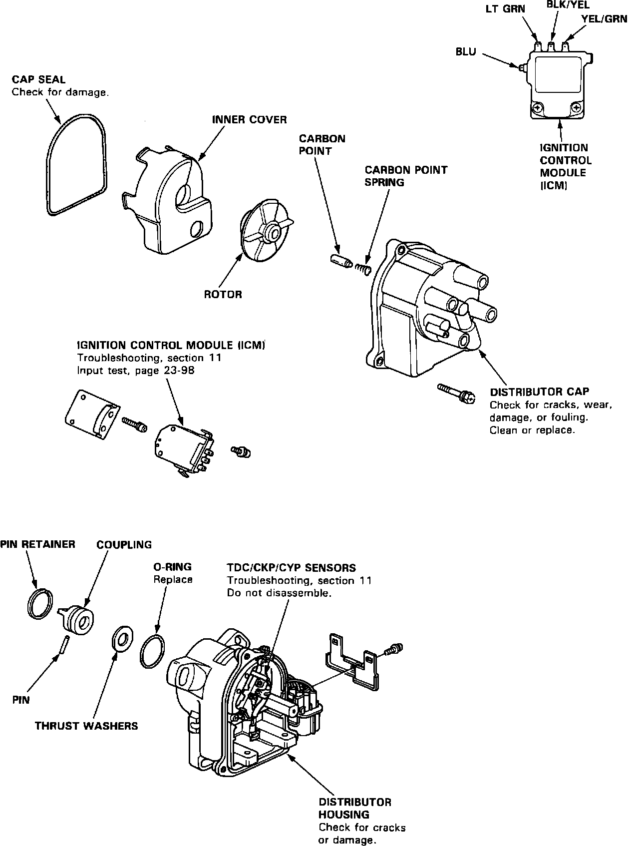 7. Check the distributor cap for cracks, wear and damages. If necessary, clean or replace it.