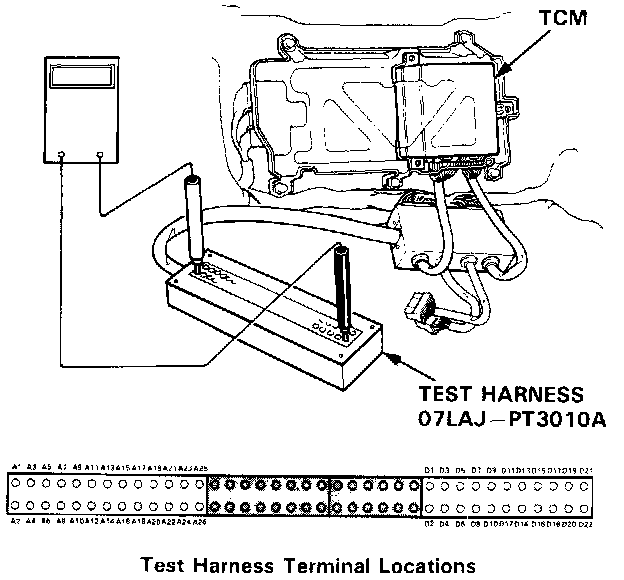 If the inspection for a particular DTC requires the use of the test harness (07LAJ--PT3010A): Connect the wire harness to the Test Harness, and/or connect the Test Harness to the TCM according to the troubleshooting flowchart.