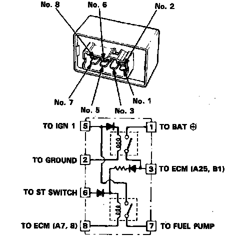 2. Attach the battery positive terminal to the No. 6 terminal and the battery negative terminal to the No. 8 terminal of the PGM-FI main relay. Then check for continuity between the No. 5 terminal and No.7 terminal of the PGM-FI main relay.