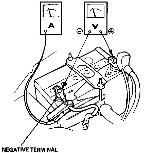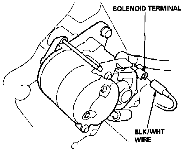 ^ Test again. If the starter still does not crank the engine, bypass the ignition switch circuit as follows (make sure the transmission is in neutral): Unplug the connector (BLK/WHT wire and solenoid terminal wire) from the starter. Connect a jumper wire from the battery positive (+1 terminal to the solenoid terminal. The starter should crank the engine.