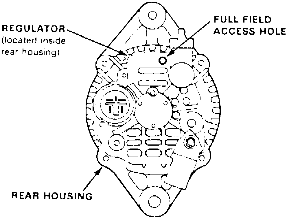8. With engine speed still at 2000 RPM, ground full field access hole in rear of alternator and note amperage reading, Fig. 1. The voltage will rise quickly when alternator is fully fielded. Do not allow voltage to exceed 18 volts or damage to electrical system may result.
