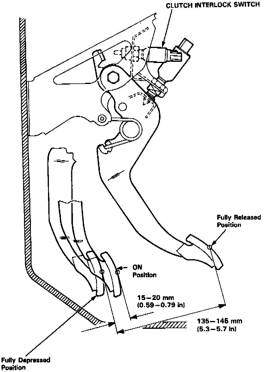 The clutch interlock switch turns on at the position where the clutch disengages: 15-20 mm (0.59-0.79 in) from the fully depressed position of the clutch pedal.