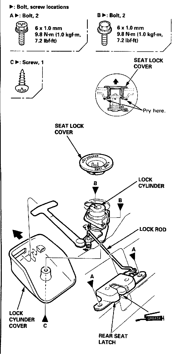 5. If necessary, remove the rear seat latch, lock cylinder and rear seat pivot bracket.