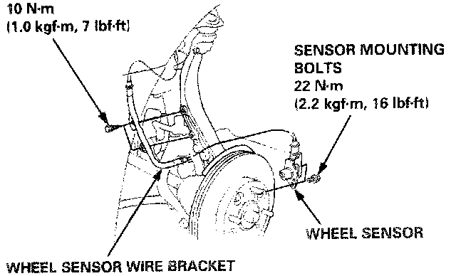 6. On ABS equipped cars, install the wheel sensor with the sensor mounting bolts.