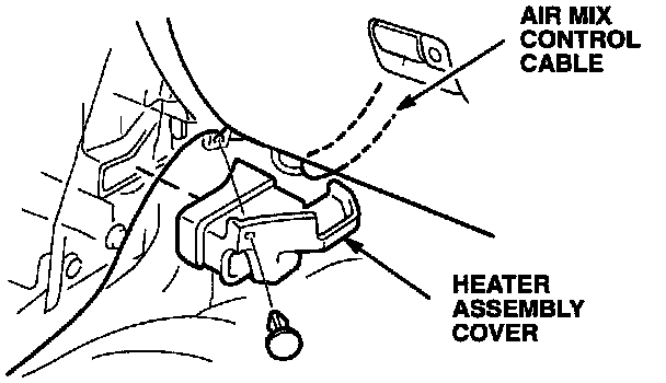 16. Reconnect the air mix control cable end to the arm. Push on the air mix control arm to make sure the air mix doors are closed; then pull back on the air mix control outer cable to remove the slack in the inner cable, and snap the outer cable into the retaining clip.