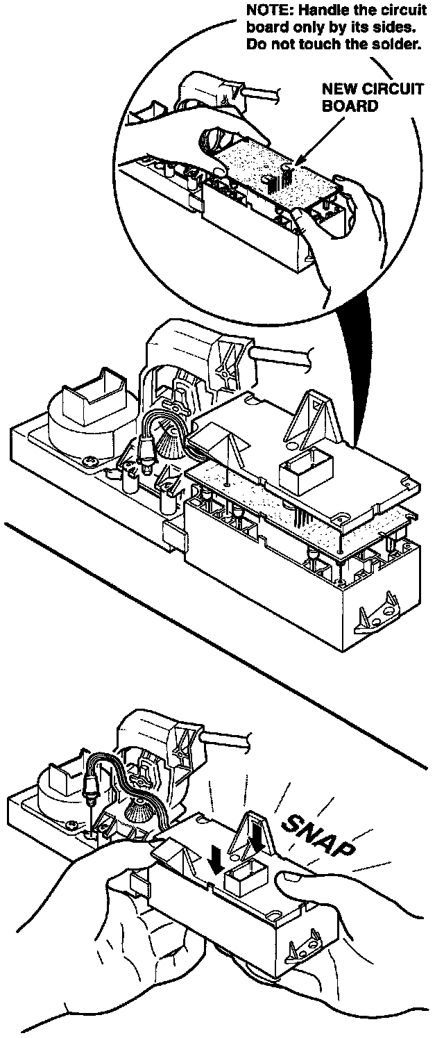 12. Place the new circuit board in position. Place the rear cover in position on the circuit board. Push down evenly on the rear cover to snap the circuit board and rear cover into place.