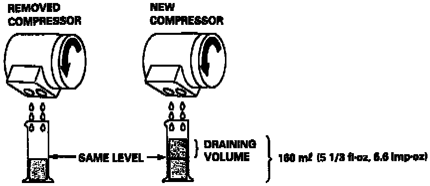 NOTE: Even if no oil is drained from the removed compressor, don't drain more than 50 ml (1 2/3 fl-oz) from the new compressor.