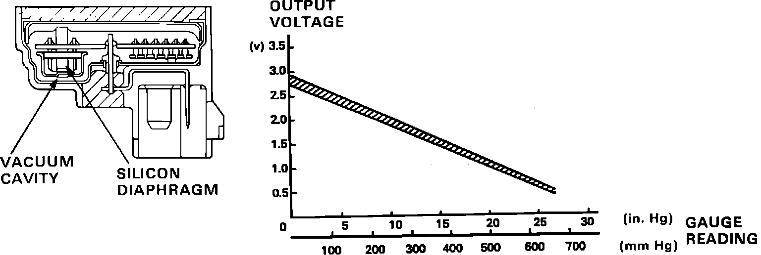 The ECM supplies a 5 volt signal and a ground to the sensor. Changes in the pressure differential between the sealed cavity and the atmosphere cause the silicon to flex. The flexing of the silicon generates a small voltage which is amplified by the support circuitry and used to modify the fixed 5 volt signal supplied by the ECM. The modified signal is then returned to ECM.