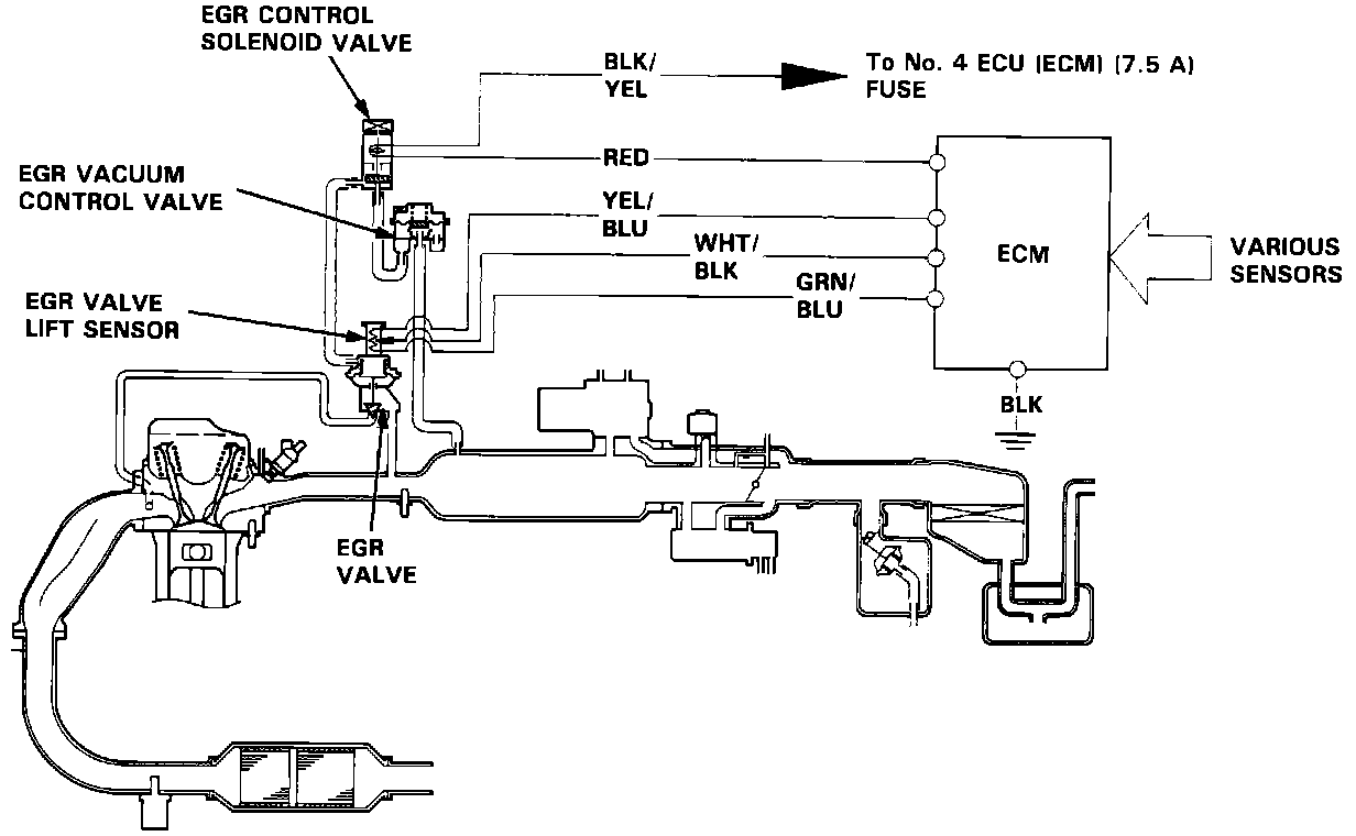 The EGR valve is equipped with a lift-sensor. It sends a signal to the ECM of how far the EGR valve is open. With information from the lift-sensor, the ECM controls the amount of exhaust gas entering the combustion chamber, by varying the voltage to the EGR Control Solenoid valve.