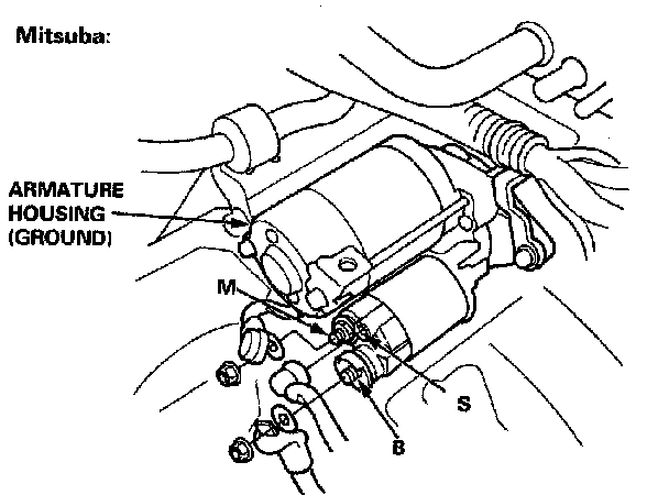 1. Check the hold-in coil for continuity between the S terminal and the armature housing (ground). The coil is OK if there is continuity.