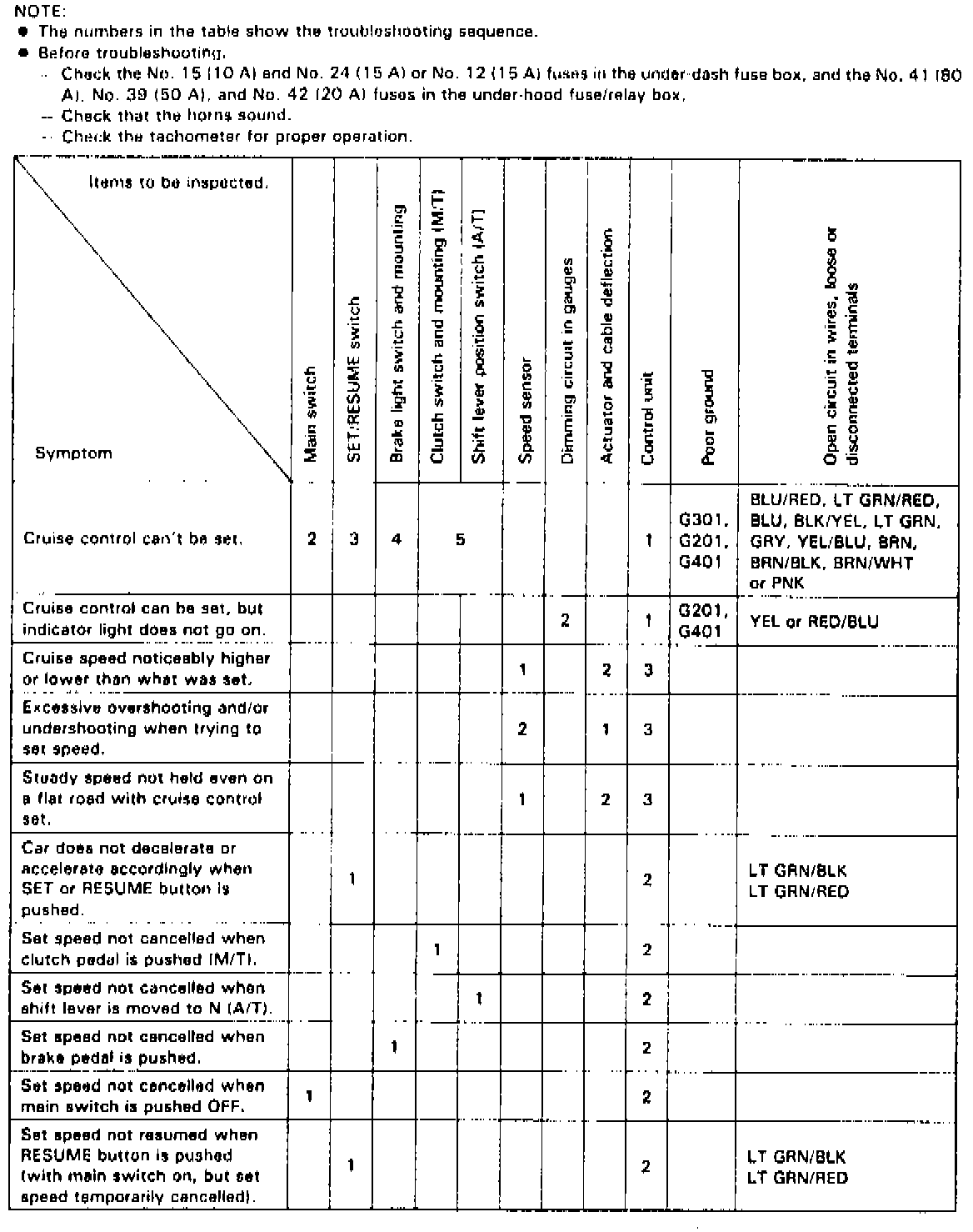 Prior to troubleshooting the speed control system, check No. 15 (10A) and No. 24 (15A) or No. 12 (15A) fuses in the fuse box and the No. 41 (80A), No. 39 (50A) and No. 42 (20A) fuses in the relay box. If fuses are operating, ensure horn sounds properly and tachometer functions properly. Refer to troubleshooting sequence, Fig. 3.