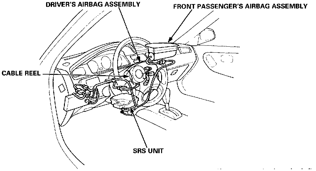 The SRS is a safety device which, when used in conjunction with the seat belt, is designed to help protect the driver and front passenger in a frontal impact exceeding a certain set limit. The system consists of the SRS unit (including safing sensor and impact sensor), the cable reel and driver's airbag, and front passenger's airbag.