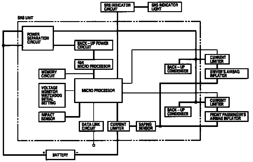 The main circuit in the SRS unit senses and judges the force of impact and, if necessary, ignites the inflator charges, If battery voltage is too low or power is disconnected due to the impact, the back-up power circuit will keep voltage at a constant level.
