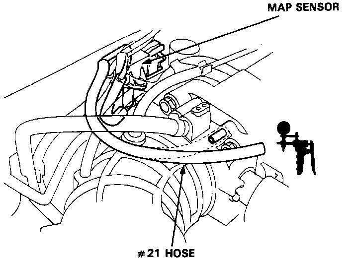 2. Disconnect #21 vacuum hose from the throttle body and apply vacuum. It should hold vacuum (if it does not hold vacuum, test MAP sensor separately from hose. If MAP sensor still does not hold vacuum, replace MAP sensor).