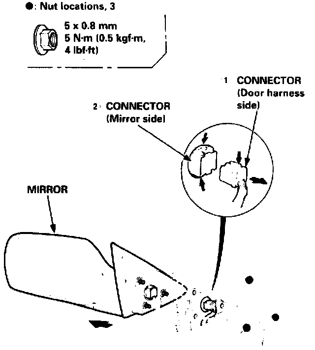 2. Disconnect the connector. Remove the nuts, then remove the mirror while holding it.