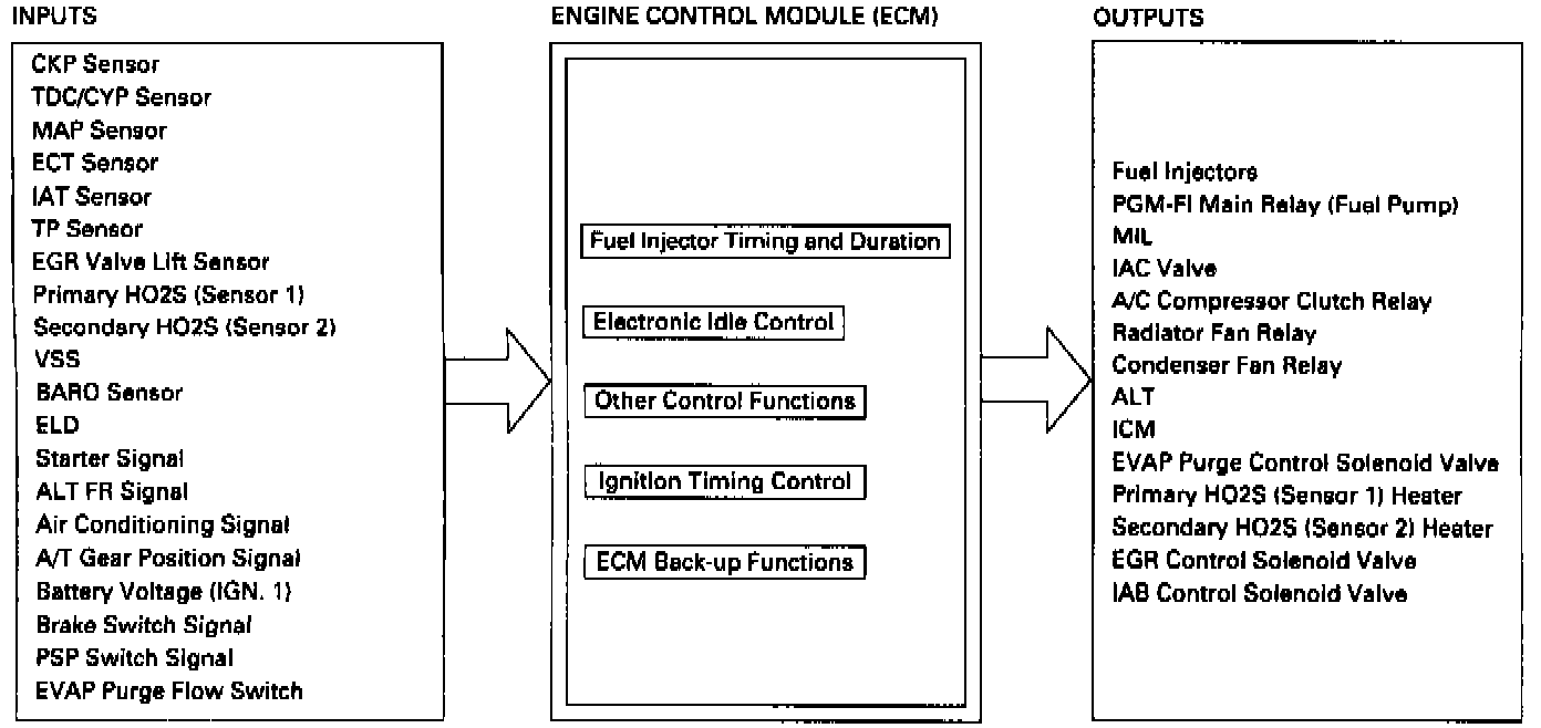 When an abnormality occurs in a signal from a sensor, the ECM ignores that signal and assumes a pre-programmed value for that sensor that allows the engine to continue to run.