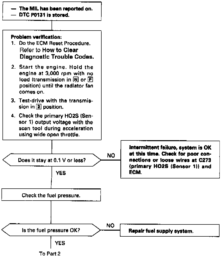 [P0131] The scan tool indicates Diagnostic Trouble Code (DTC) PO131: A low voltage problem in the Primary Heated Oxygen Sensor (Primary HO2S) (Sensor 1) circuit.