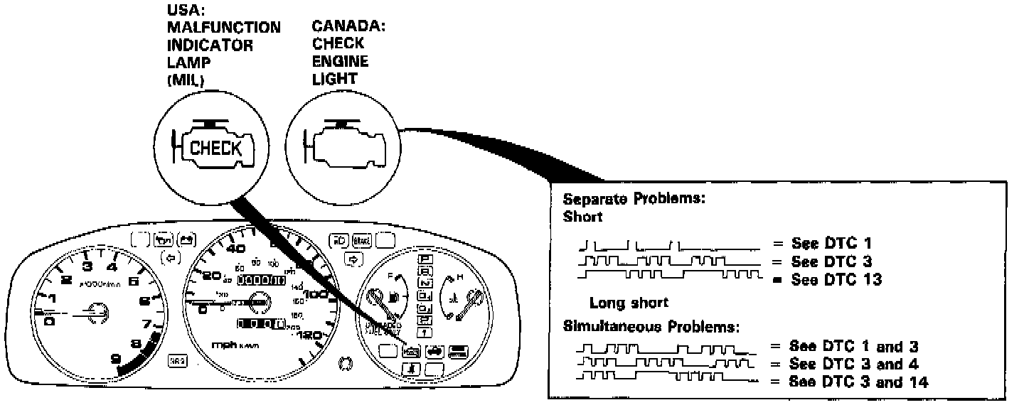 2. Note the Diagnostic Trouble Code (DTC): The MIL indicates a code by the length and number of blinks. The MIL can indicate simultaneous component problems by blinking separate codes, one after another. Codes I through 9 are indicated by individual short blinks. Codes 10 through 48 are indicated by a series of long and short blinks. The number of long blinks equals the first digit, the number of