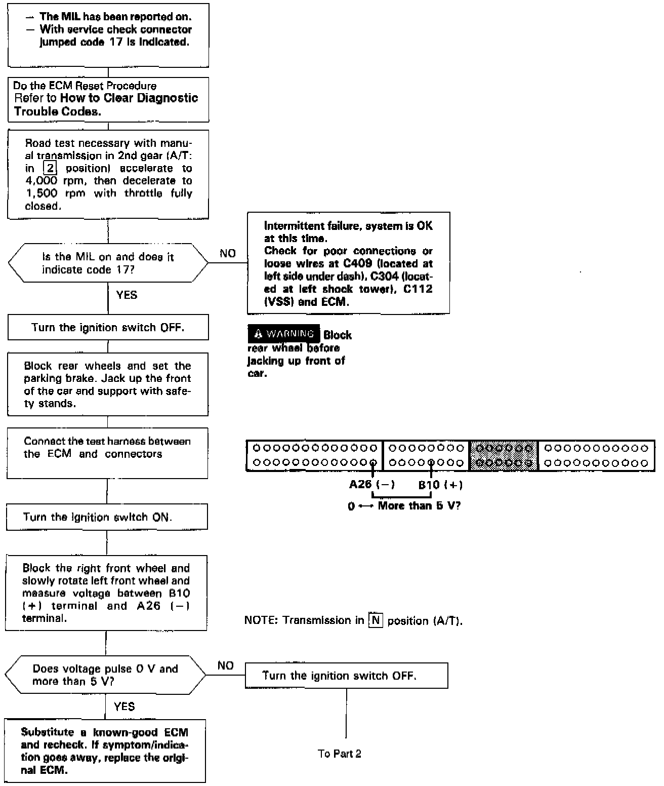 The Malfunction Indicator Lamp (MIL) indicates Diagnostic Trouble Code (DTC) 17: A problem in the Vehicle Speed Sensor (VSS) circuit.
