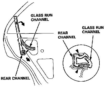NOTE: To install, the glass run channel, fit it into the reat channel an shown.