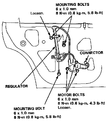5. Remove the two mounting bolts. Loosen the mounting bolt and three motor bolts. Disconnect the connector (power window model). Remove the regulator through the center hole in the door.