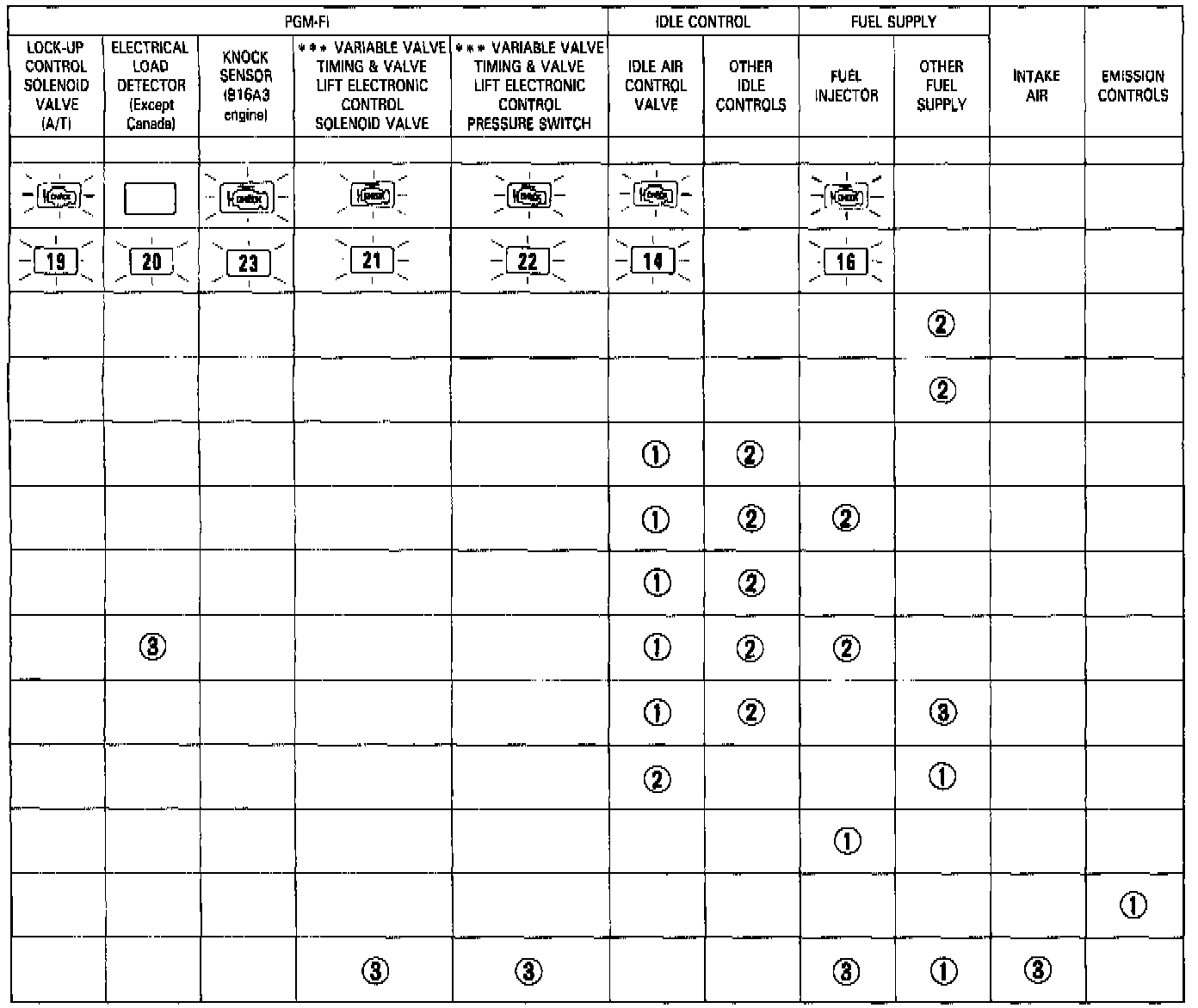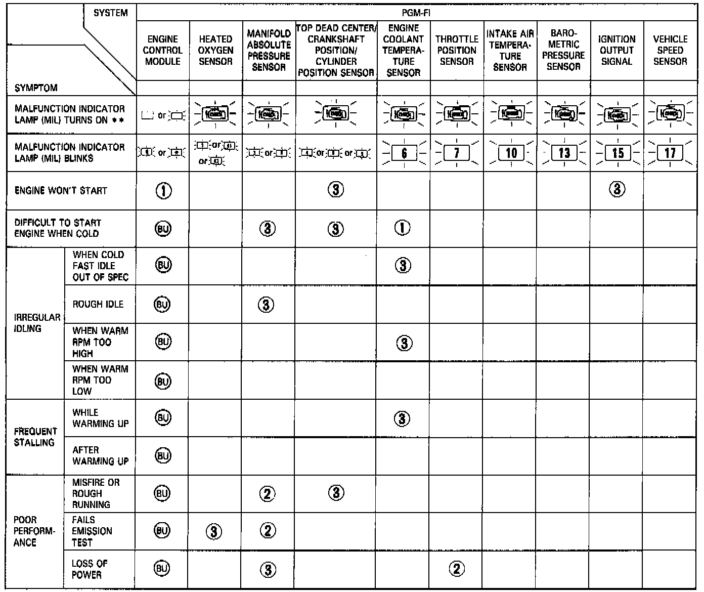 NOTE: Across each row in the chart, the systems that could be sources of a symptom are ranked in the order they should be inspected starting with "1". Find the symptom in the left column, read across to the most likely source, then refer to that component listed at the top of that column. If inspection shows the system is OK, try the next most likely system "2", etc..