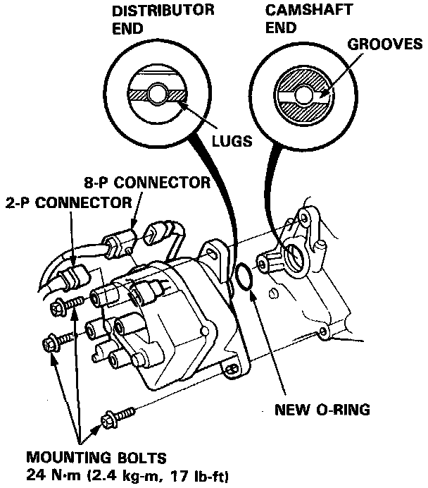 NOTE: The Lugs on the end of the Distributor and their mating grooves in the Camshaft end are both offset to eliminate the possibility of installing the Distributor 180° out of time.