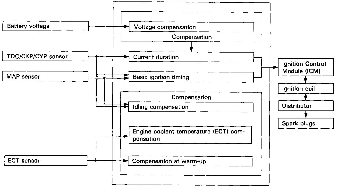 The Control Unit has stored within it the optimum basic Ignition Timing for operating conditions based upon Engine speed and Intake Manifold Pressure. With compensating signals from Sensors, the system determines optimum Ignition Timing and duration for ambient conditions and sends voltage pulses to the Ignition Control Module (ICM).