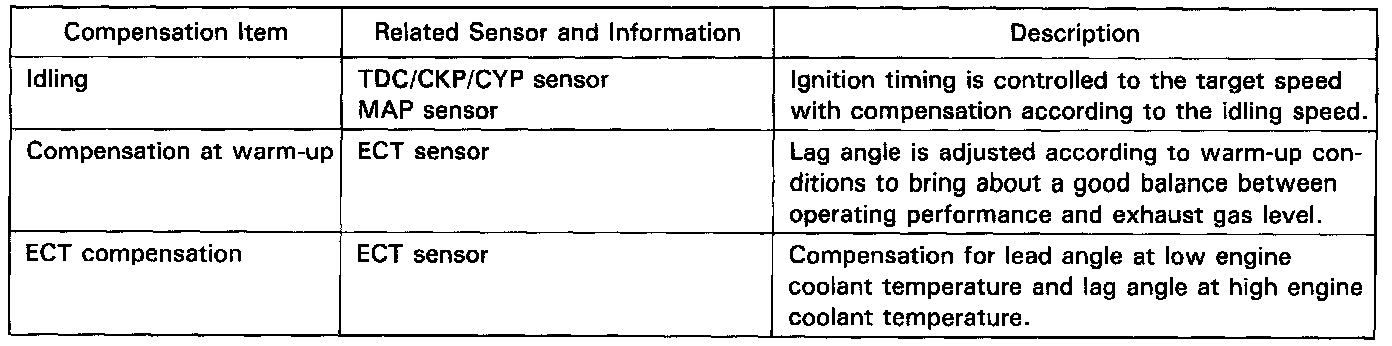 Ignition Timing is fixed at 7° BTDC for cranking. The cranking is detected by the TDC Sensor (cranking rpm) and Starter signal.