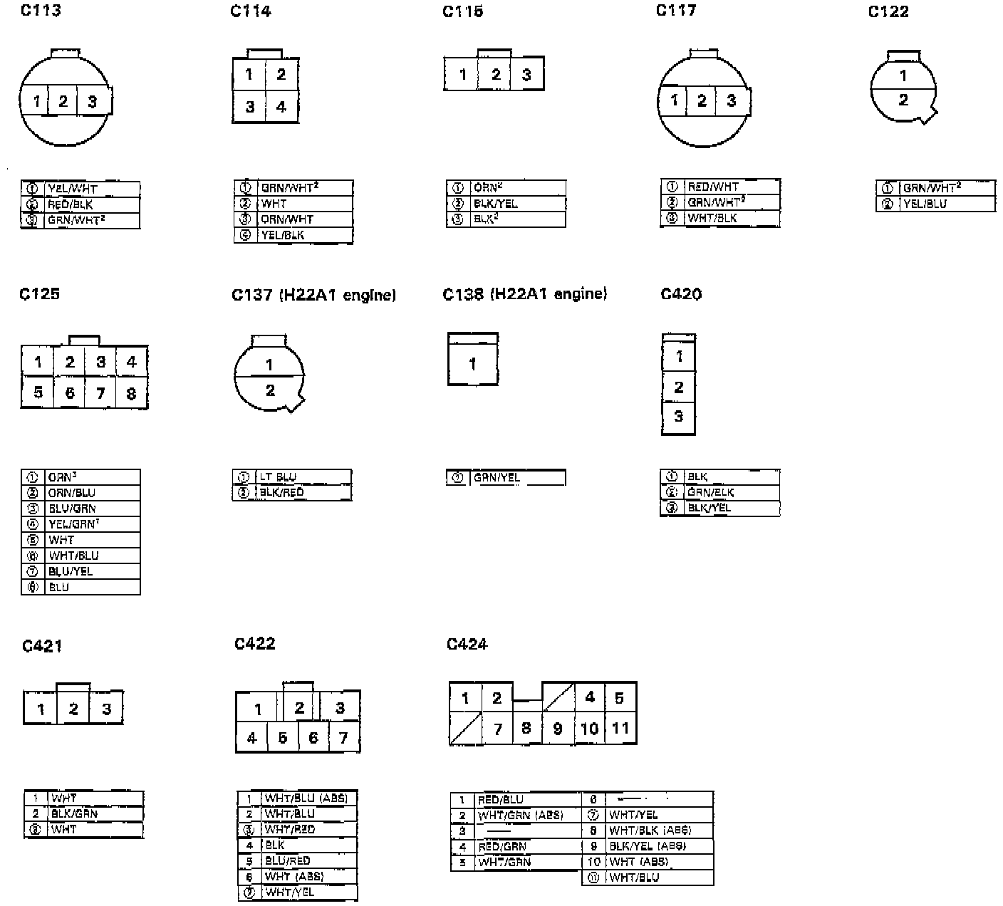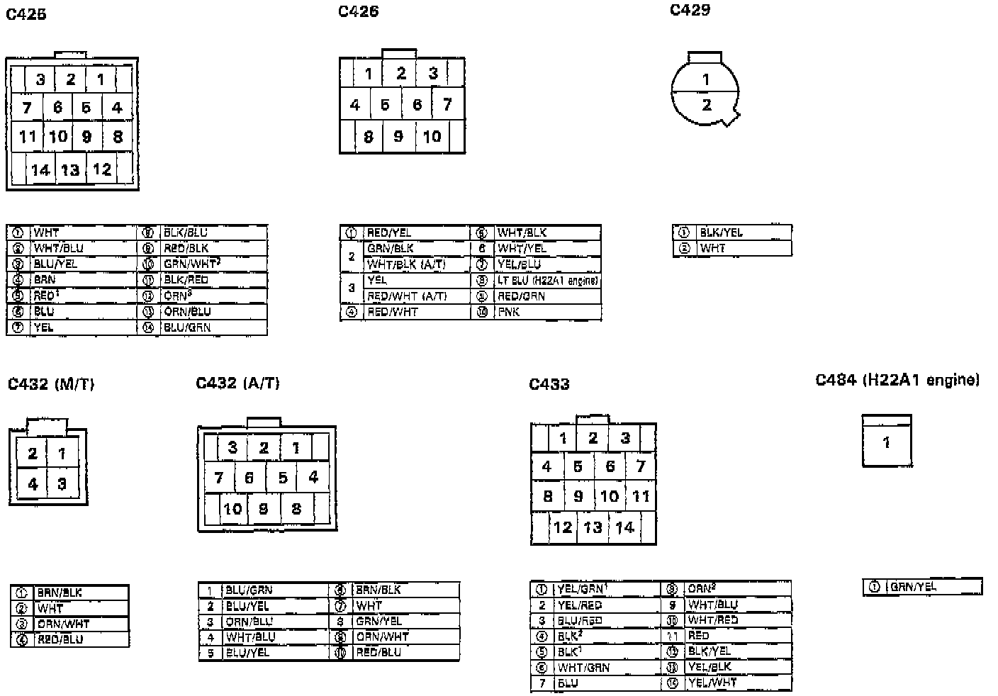 Different wires with the same color have been given a number suffix to distinguish them (for example, YEL/BLK1 and YEL/BLK2 are not the same).
