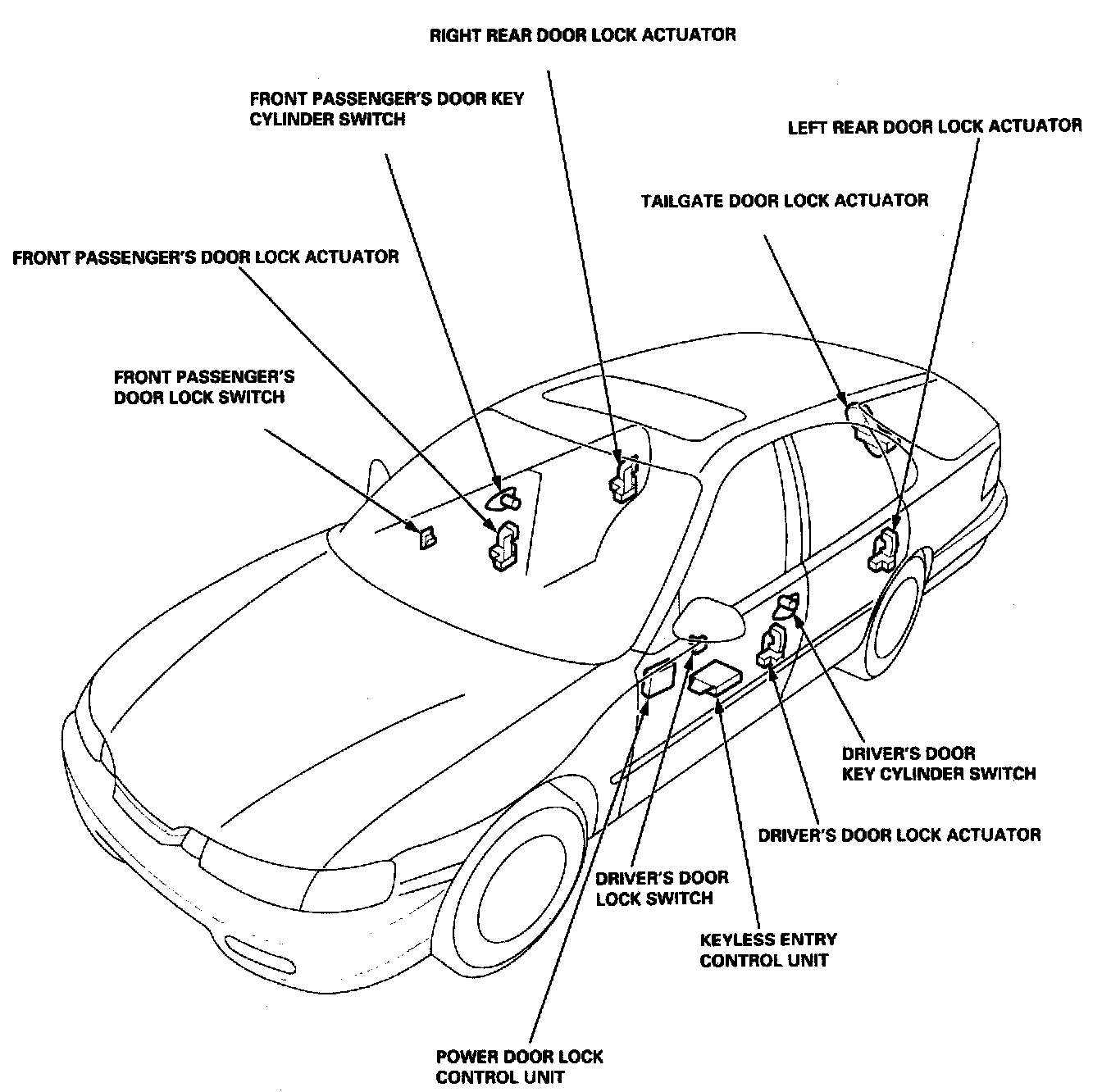 For this model, a new door lock system has been adopted to improve convenience and safety. If the key is inserted into the driver's door key cylinder, turned to the unlock position, and pulled out immediately thereafter, ONLY the driver's door will unlock. However, if the key is kept in the unlock position for one second or more, ALL doors will unlock.