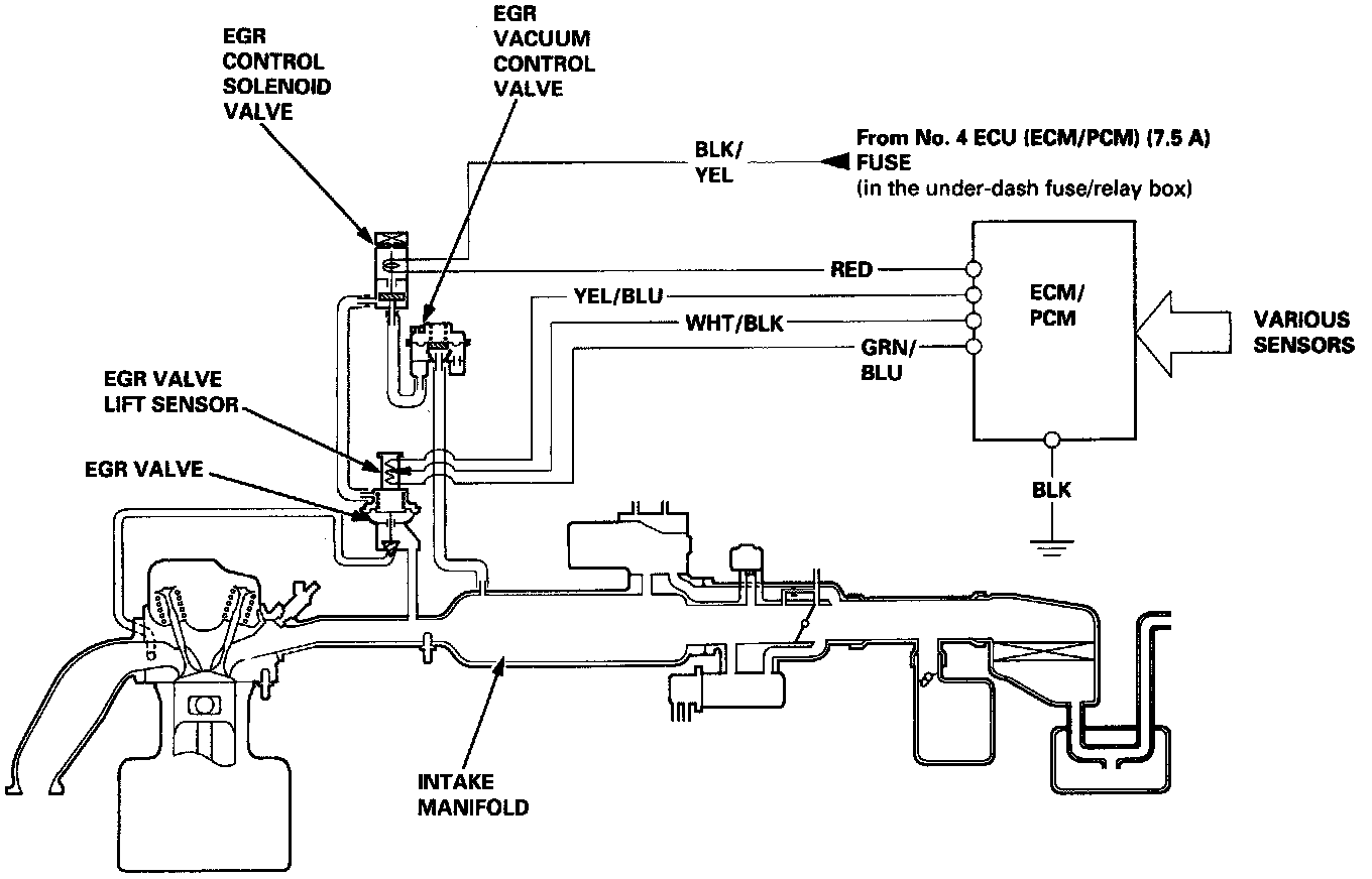 The EGR system is designed to reduce oxides of nitrogen emissions (NOx) by recirculating exhaust gas through the EGR valve and the intake manifold into the combustion chambers. It is composed of the EGR valve, EGR vacuum control valve, EGR control solenoid valve, ECM/PCM and various sensors.