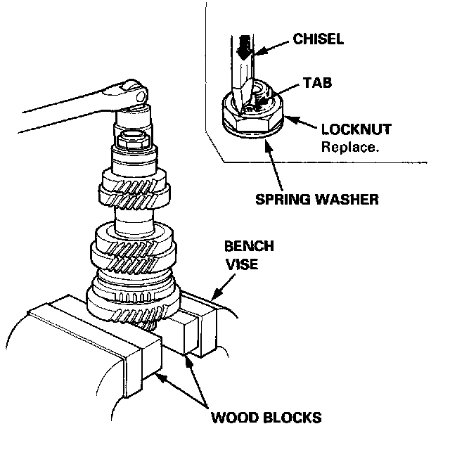 1. Securely clamp the countershaft assembly in a bench vise with wood blocks.2. Raise the locknut tab from the groove in the countershaft, then remove the locknut and the spring washer.