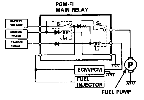 The PGM-FI main relay actually contains two individual relays. This relay is located at the right side of the cowl. One relay is energized whenever the ignition is on which supplies the battery voltage to the ECM/PCM, power to the fuel injectors, and power for the second relay. The second relay is energized for two seconds when the ignition is switched ON (II), and when the engine is running, to supply power to the fuel pump.