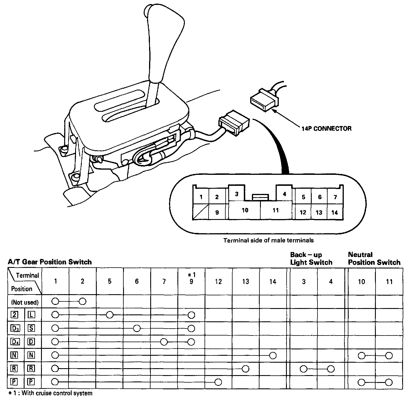 1. Remove the front console.2. Disconnect the 14P connector from the A/T gear position switch.
