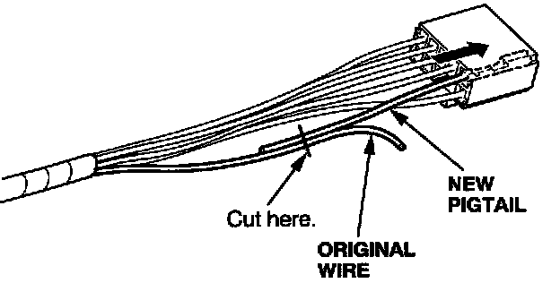 6. Lay the pigtail and the original wire side-by-side, and cut off both ends at once. If you are making more than one splice, do not cut each pigtail at the same location; the resulting "lump" of splice connectors would interfere with rewrapping the harness. Instead, cut the first pigtail close enough to the terminal so you will have room to make each remaining cut about 20 mm (3/4 inch) farther down on the next pigtail.