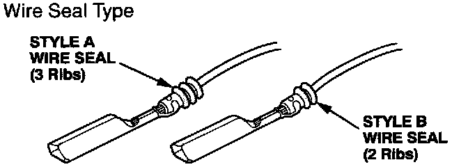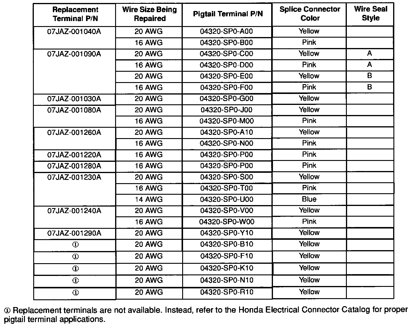 Select the proper size pigtail terminal by matching the replacement terminal part number and the wire size being repaired to the corresponding pigtail terminal part number. Then use the color (size) splice connector listed. In some instances you may also have to match the wire seal style to select the proper pigtail terminal. Pigtail terminals are available through your parts department in quantities of 10, using normal parts ordering procedures.