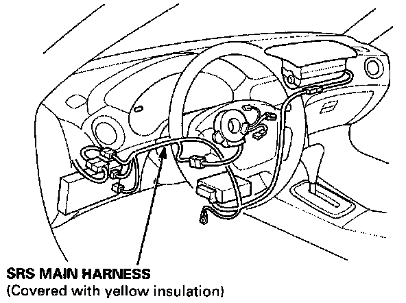 ^ All SRS wire harnesses are covered with yellow insulation. Before you disconnect any part of an SRS wire harness, disconnect the airbag connectors.