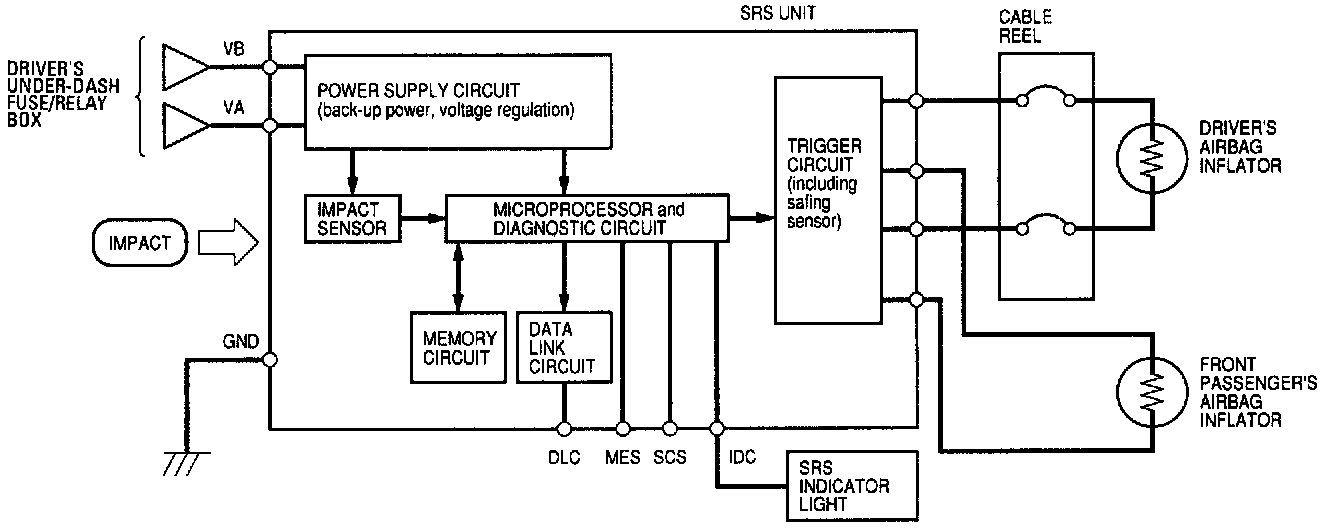 The SRS is a safety device which, when used in conjunction with the seat belt, is designed to help protect the driver and front passenger in a frontal impact exceeding a certain set limit. The system consists of the SRS unit (including safing sensor and impact sensor), the cable reel, the driver's airbag, and front passenger's airbag.