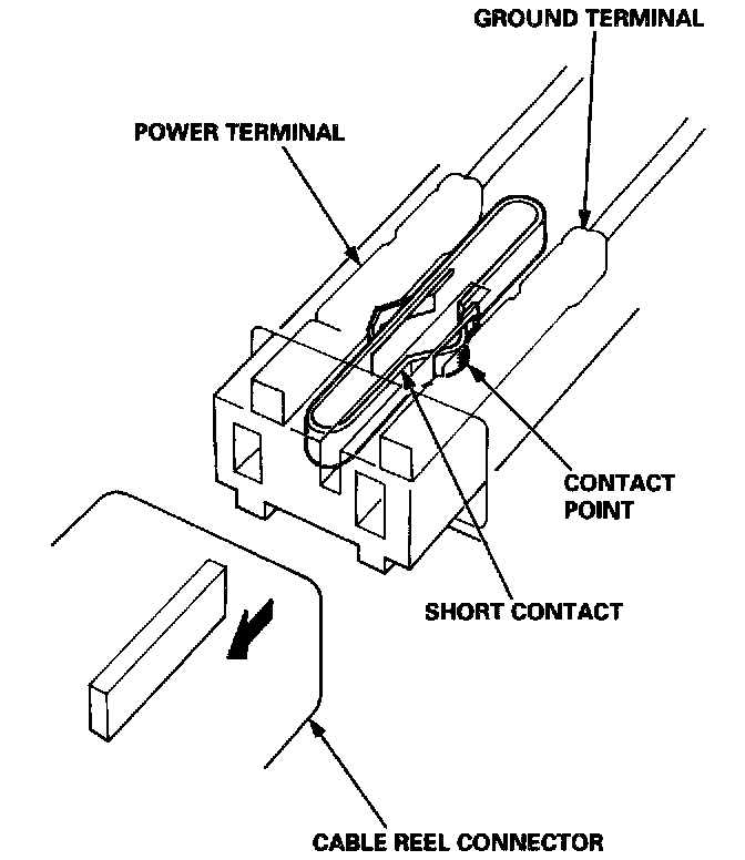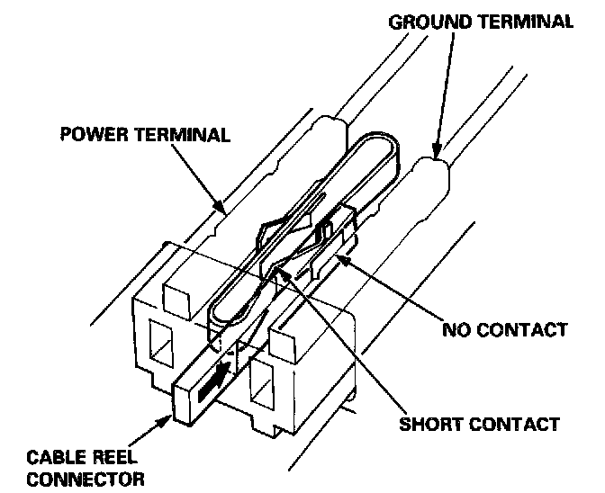 The driver's airbag (and front passenger's) airbag has a spring-loaded lock connector with a built-in short contact. When this connector is disconnected, the power terminal and the ground terminal in the airbag connector are automatically shorted.