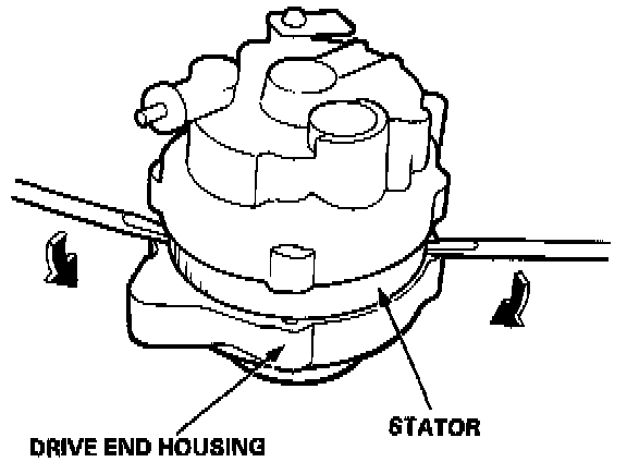 3. Separate the rear housing from the drive-end housing by inserting a flat tip screwdriver into the openings and prying them apart. Take care not to damage the stator with the tip of the screwdriver.