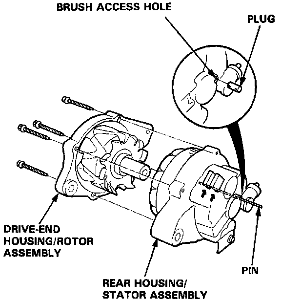3. Put the rear housing/stator assembly and drive-end housing/rotor assembly together, tighten the four through bolts, pull out the pin, and plug the brush access hole.