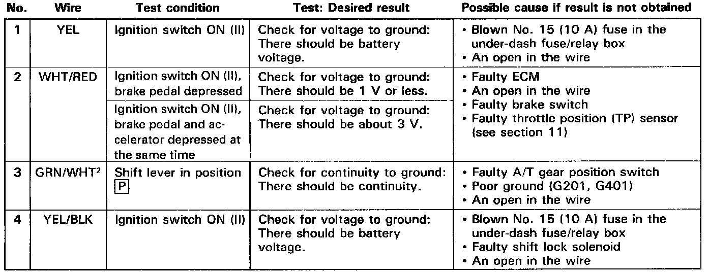 NOTE: If the shift lock solenoid clicks when the ignition switch is turned ON (II) and you step on the brake pedal (with the shift lever in [P]) the shift lock system is electronically normal; if the shift lever cannot be shifted from [P], test the A/T gear position switch.