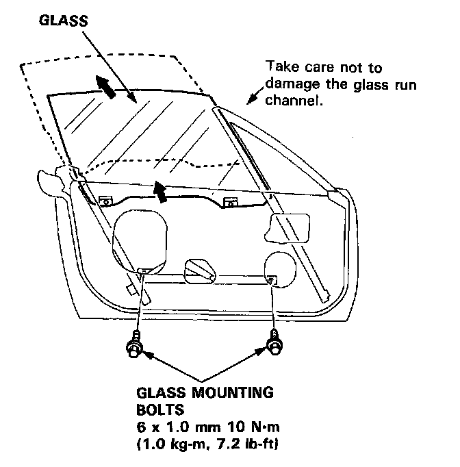 13. Roll the glass up and down to see if it moves freely without binding. Also make sure that there is no clearance between the glass and glass run channel when the glass is closed. Adjust the position of the glass as necessary.