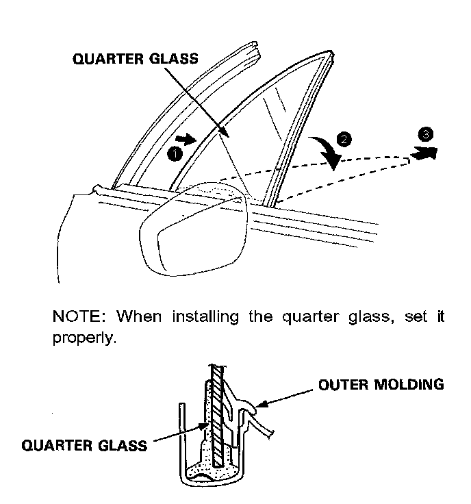 7. Remove the quarter glass as shown.