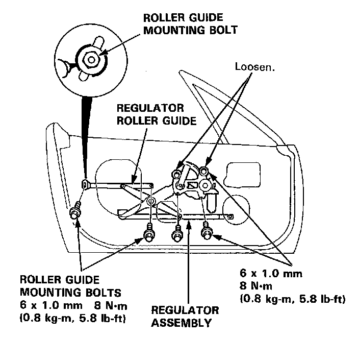 9. Remove the two mounting bolts, two roller guide bolts and loosen the two motor bolts. Disconnect the connector. Remove the regulator assembly through the center hole in the door.