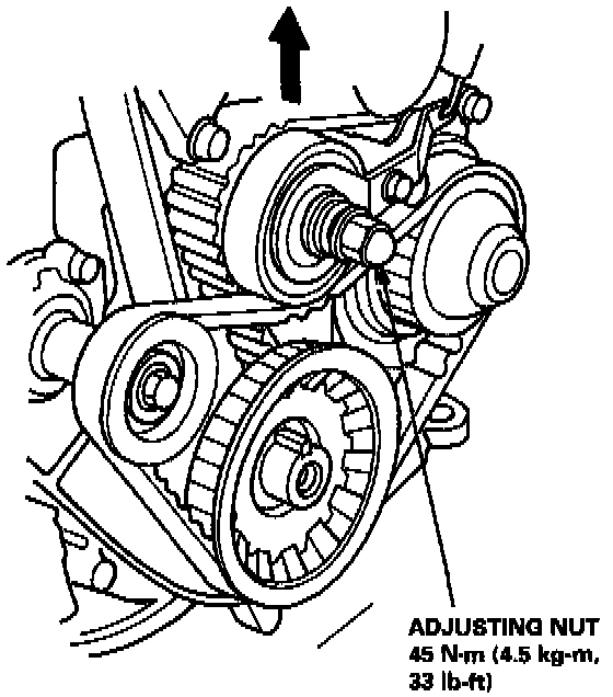 10. Loosen the adjusting nut 2/3-1 turn. Push the tensioner to remove tension from the timing balancer belt, then retighten the adjusting nut.
